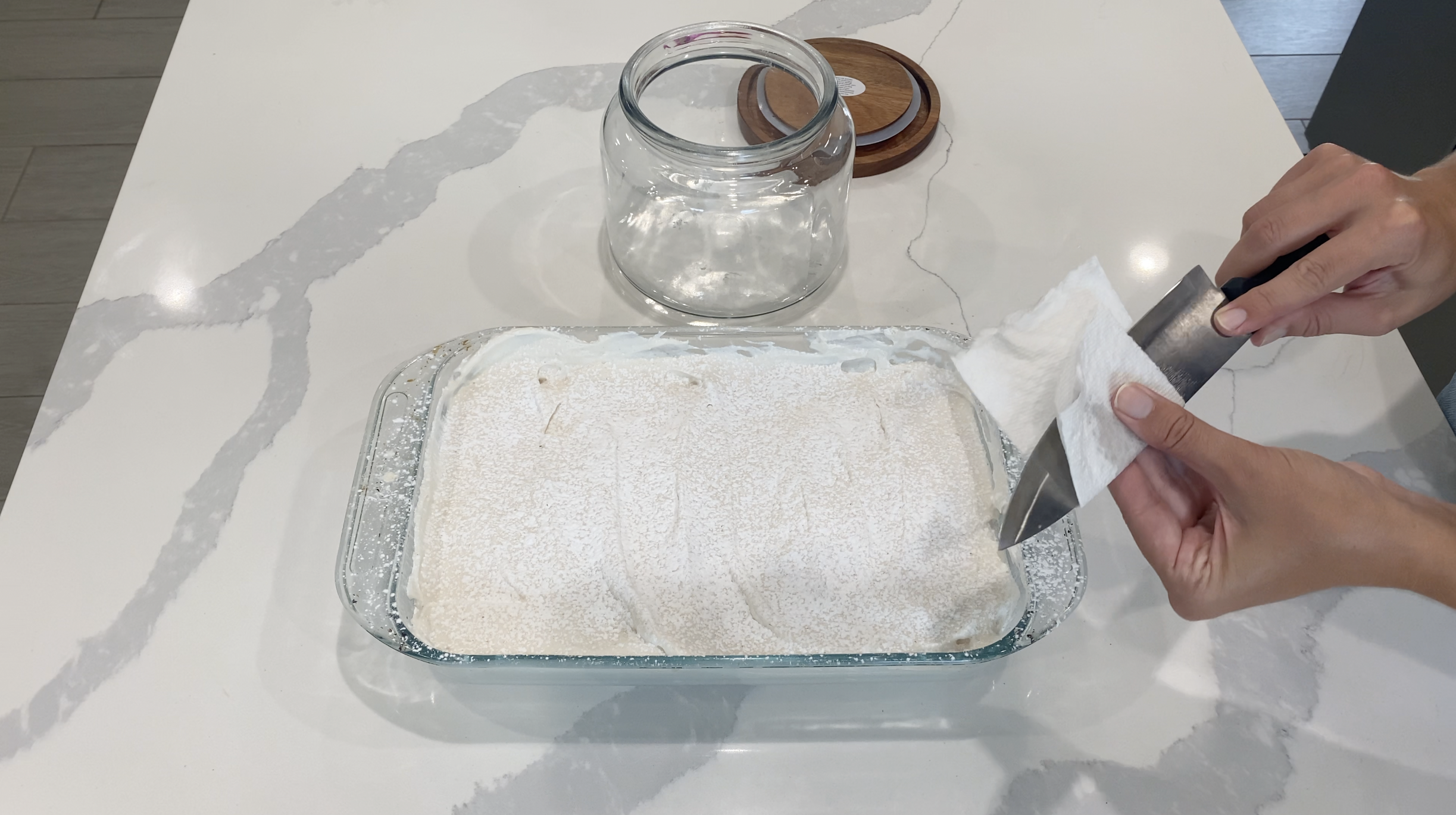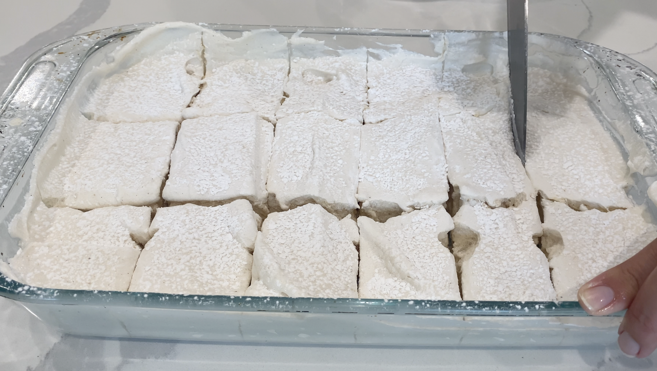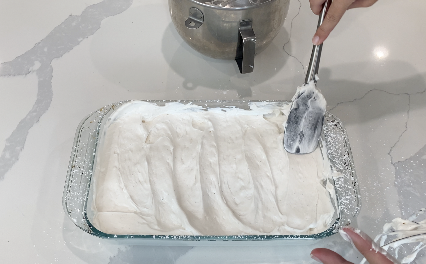5. Once your marshmallow fluff has formed, spread it into your powdered casserole dish, working quickly before the fluff sets! Once smoothed out in your dish, allow to set for 5-7 hours, then sprinkle another 1/2 tablespoon of arrowroot powder over the top of your marshmallows.