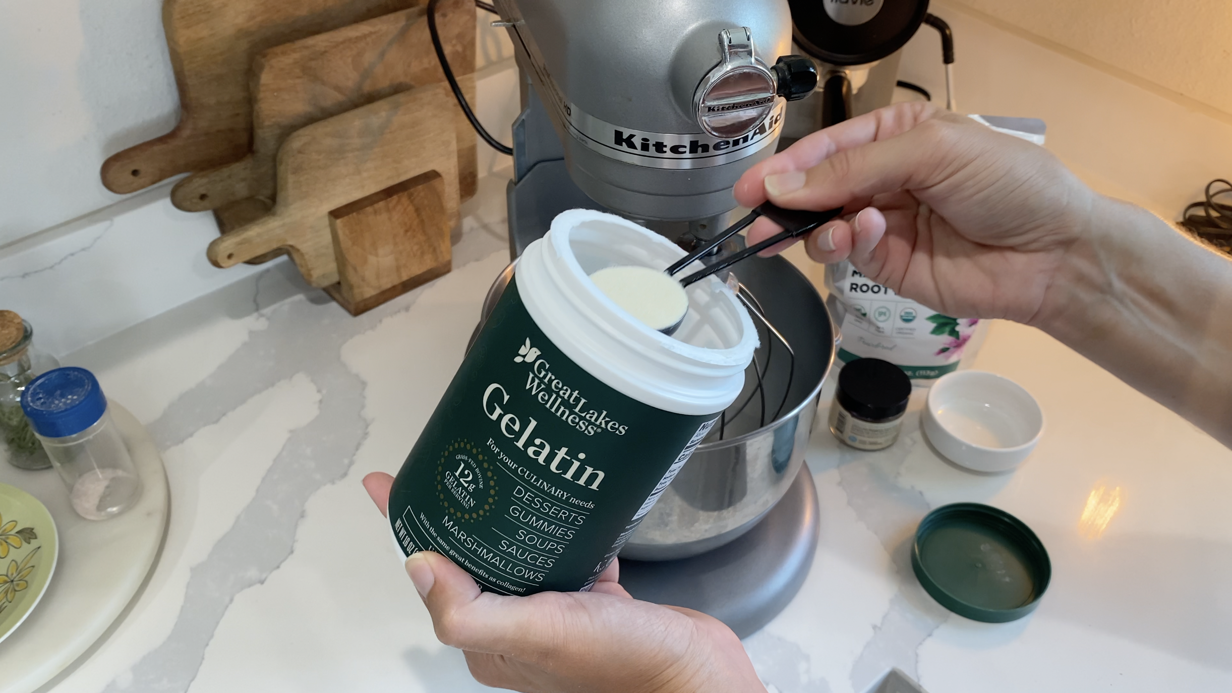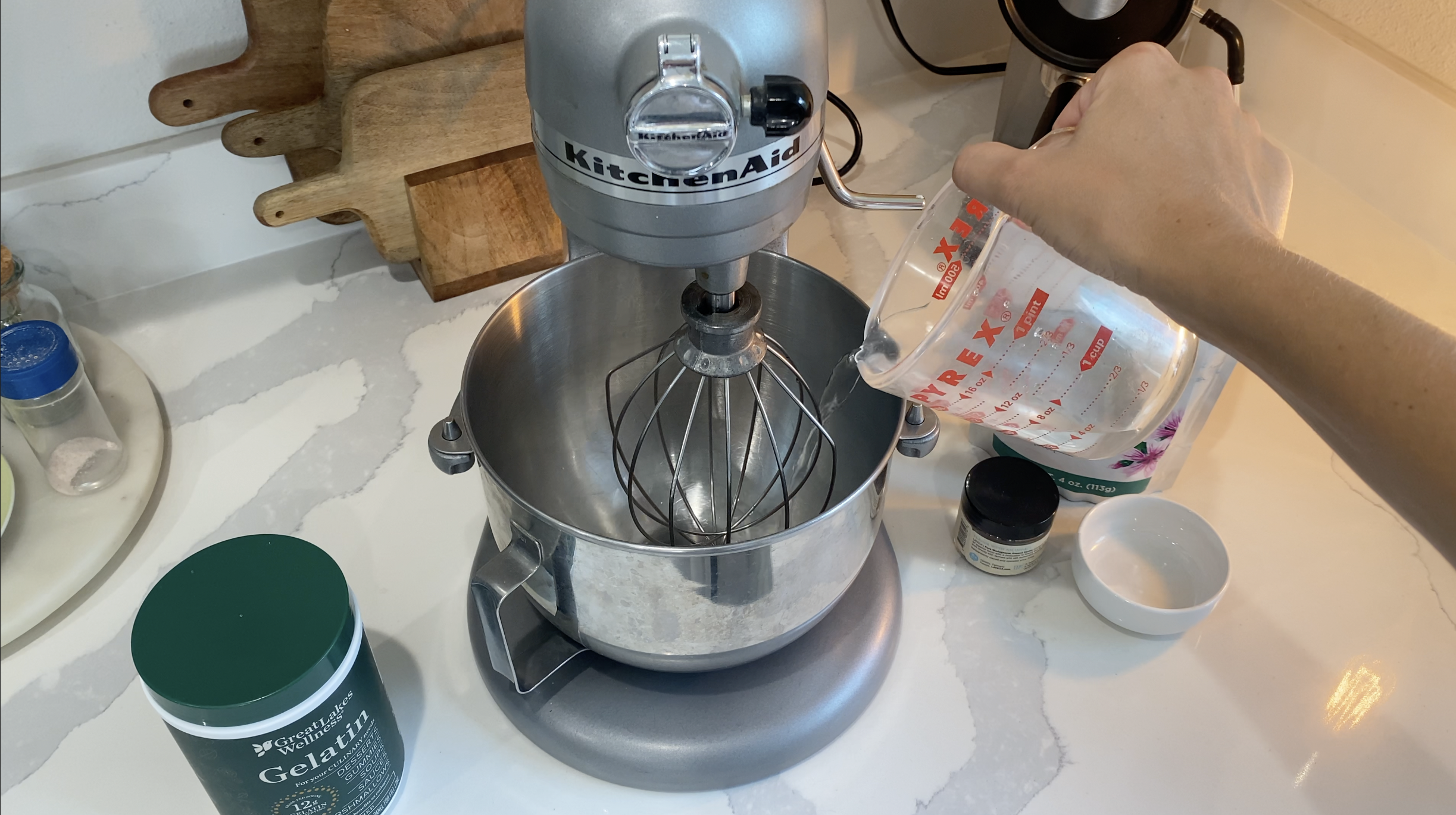 1. Pour 1/2 cup water in your stand mixer. Sprinkle 3 tablespoons of beef gelatin over the water and allow to soak or "bloom" for 10 minutes.