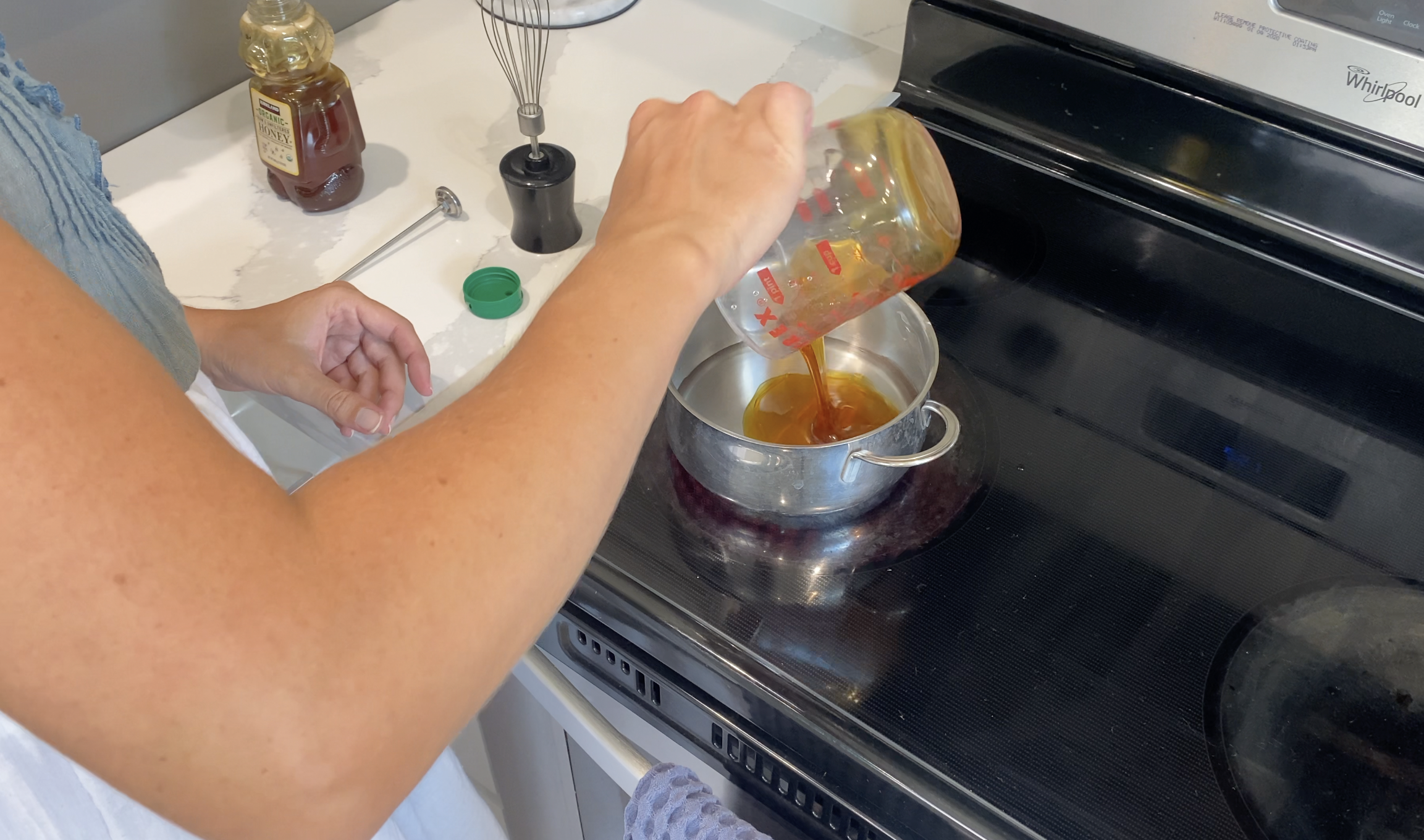 2. Add 1/2 cup water and 3/4 cup honey to a pot. Boil on medium high heat until mixture reaches 240°, about 15 minutes.